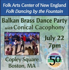 Conical Cacophony will be playing for Balkan dancing this Tuesday, at Folk Dancing by the Fountain in Copley Square Park, Boston, 7:00pm